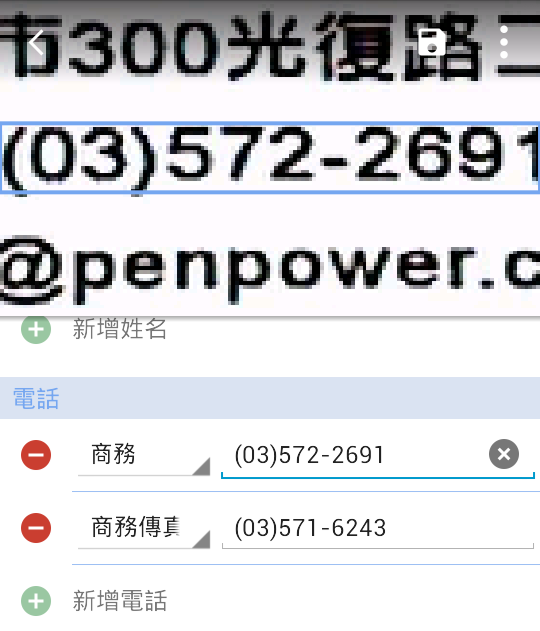 當您點選要編輯的欄位後,上方會出現該欄位資訊的原始圖像供您核對,請注意此圖像核對功能只對從這支行動裝置拍照的聯絡人有效,如聯絡人是從別處匯入的則沒有此關聯效果。