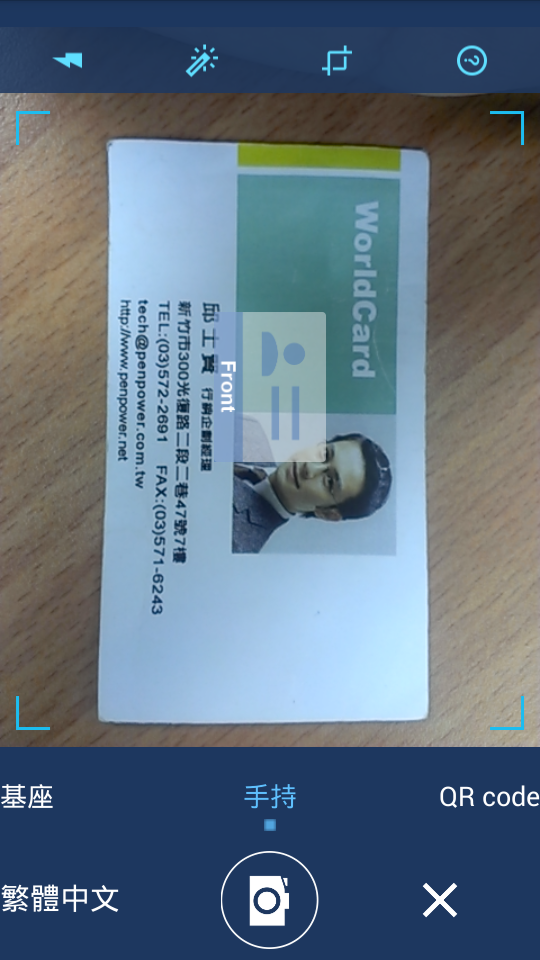 選項,請先選擇好要使用的語系,然後根據名片的直橫來拿持手機並對準名片,讓整張名片完整出現在螢幕中,並盡量在避開陰影的情況下在名片正上方拍照,以避免名片變形,接著按下相機圖示