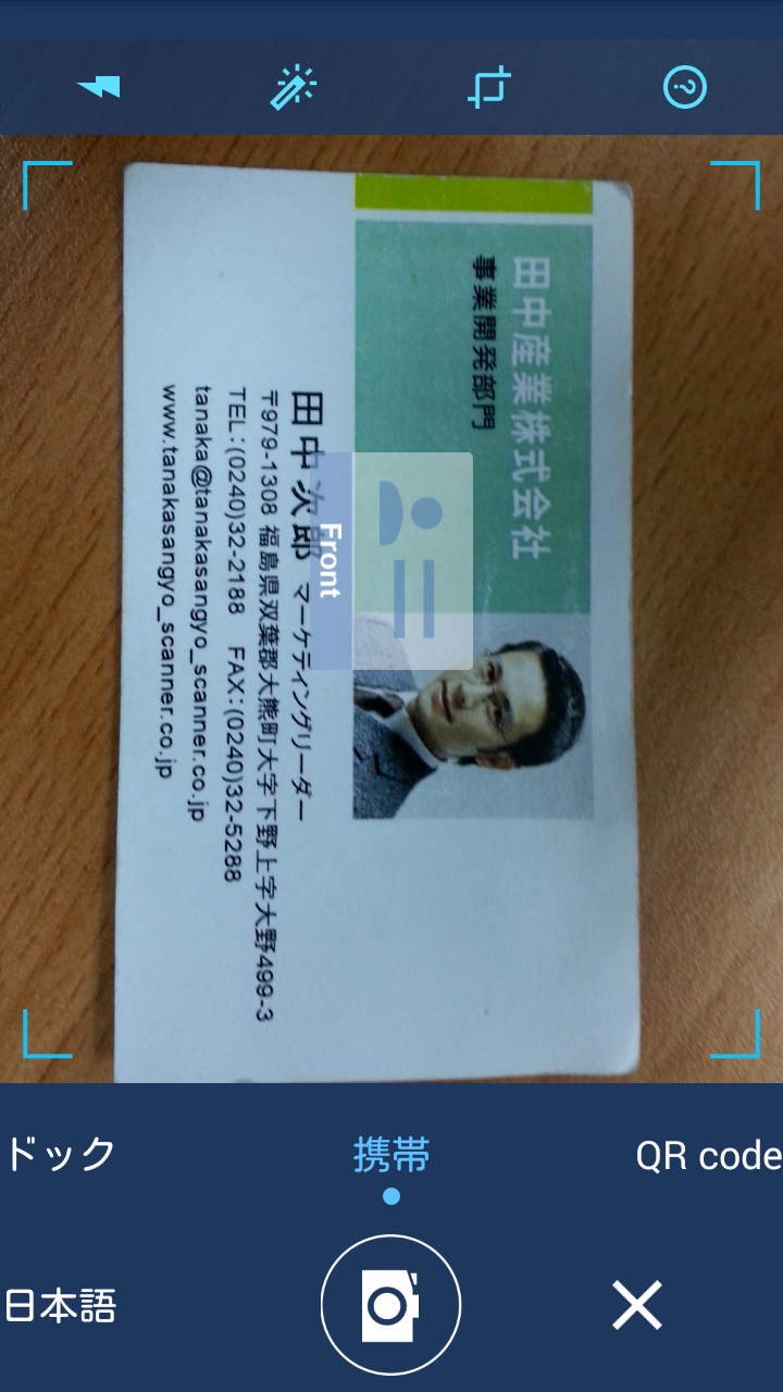 をクリックして部分認識を起動します。指二本で名刺画像を拡大、グリーンフレームを移動と縮小や拡大しながら、認識したいデータを選択し、画面下方に認識言語を選択し、右上の