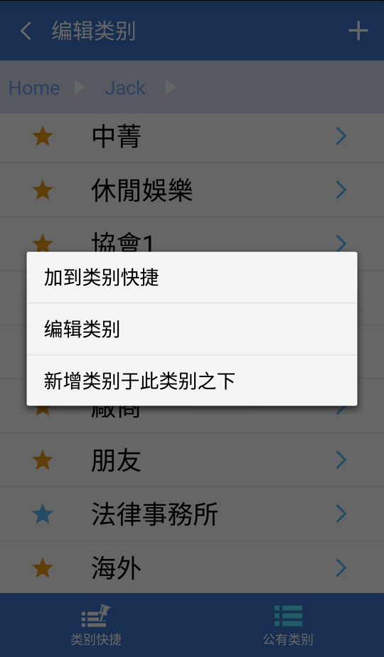 长按类别名称,选择﹝编辑类别﹞即可输入名称,修改后点击[完成]后即能于列表中看到修改后的类别。如要删除该类别,请点[删除]即可。