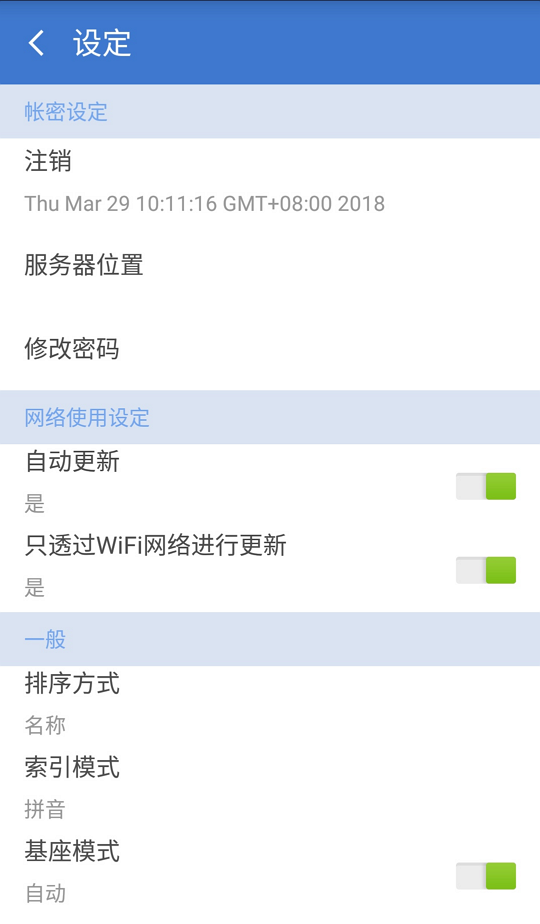网络使用设置:若启用[自动更新],系统将会自动把[我的最爱]中有异动的信息至[公有名片];取消勾选,则需要以手动更新信息。而勾选[只透过WiFi网络进行更新],则在有WiFi联机时,才能登入账号和进行数据更新。