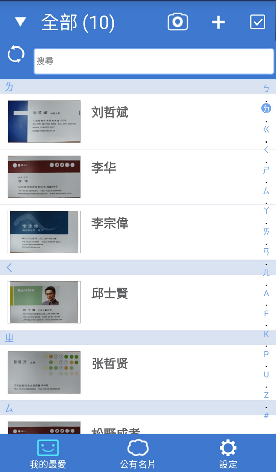 您可以於﹝公有名片﹞中將﹝公有類別﹞中的聯絡人加入到﹝我的最愛﹞,即可在我的最愛區快速檢視聯絡人資訊。