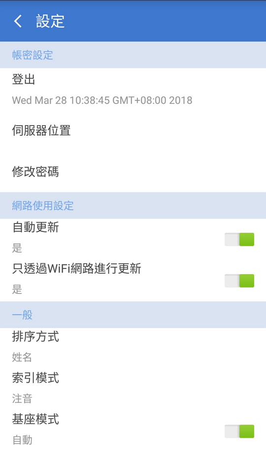 網路使用設定:若啟用[自動更新],系統將會自動把[我的最愛]中有異動的資訊至[公有名片];取消勾選,則需要以手動更新資訊。而勾選[只透過WiFi網路進行更新],則在有WiFi連線時,才能登入帳號和進行資料更新。