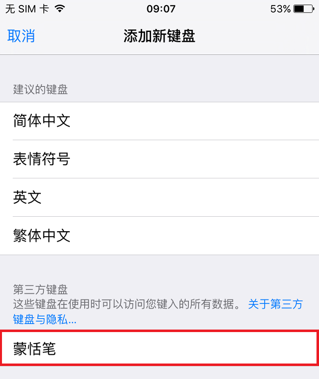 当蒙恬笔已启用,您就可以切换到蒙恬笔来使用,请先打开要写字的App,如备忘录, 接着把键盘唤起,然后长按键盘上的,然后选择