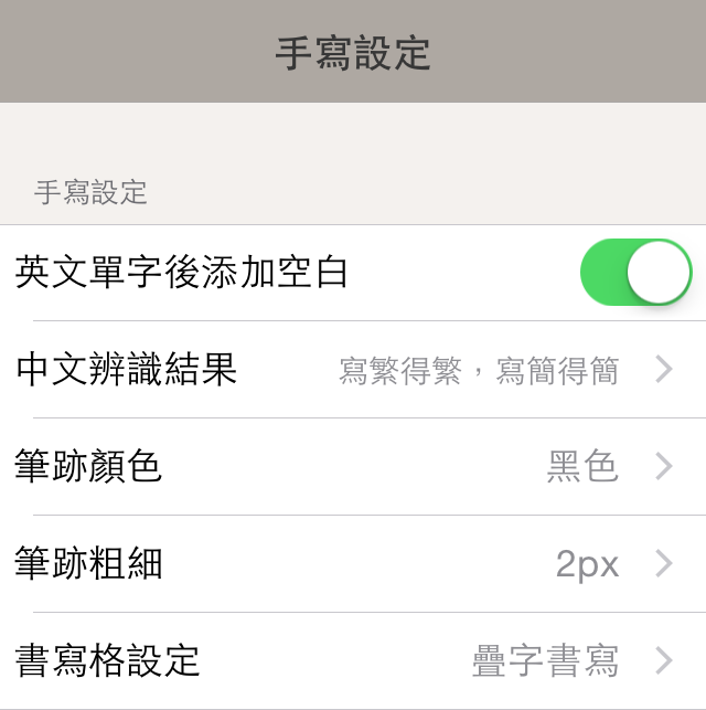 您可選擇要讓手寫辨識的結果全部用繁體字還是簡體字顯示,或者是要寫繁體字時就顯示繁體,寫簡體字就顯示簡體的混合設定。