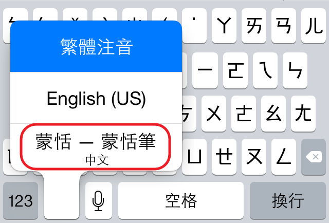 切換至下一個鍵盤:點選來切換到蒙恬筆以外的鍵盤。