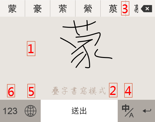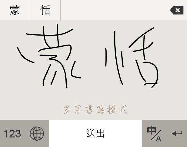 - 多字書寫:您可同時在區域內寫一至多個字,寫完後上方候選字區會有各個字的辨識結果,點選結果會出現候選字及同音字讓您做選擇,確認完畢後點選下方的