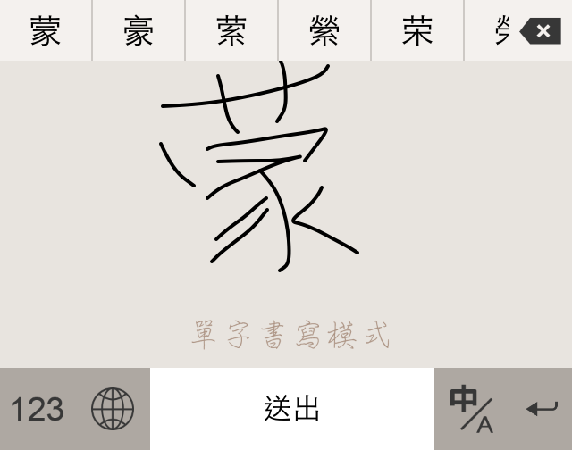 - 單字書寫:請在書寫區域內寫一個字,寫完字後上方候選字區會有結果讓您選擇,您可以滑動該候選字及同音字以觀看更多,選擇後或點選下方