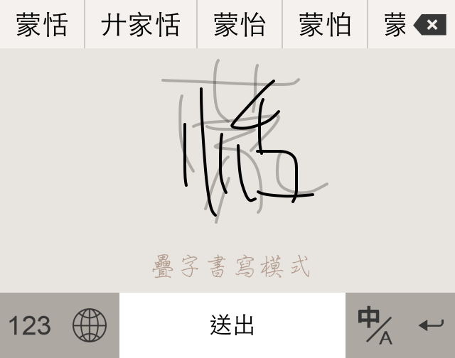 - 疊字書寫:當您寫完第一個字時,無需等待辨識即可在第一個字的筆跡上繼續寫第二個字,此時您會看到第一個字的筆跡逐漸變淡消失;您可以一直寫下第三字第四字等,寫完後即會幫您做辨識。