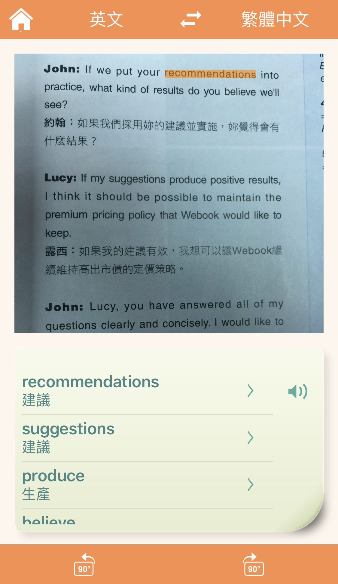 Step 2. 對焦完成後,即視即譯的模式會立即將辨識的結果以及查詢翻譯結果顯示在畫面上。除了單字的翻譯,Worldictionary 也會自動辨識對焦點的下一個字,並將這二個字合併辨識,翻譯結果會列在選單的第二個項目中。