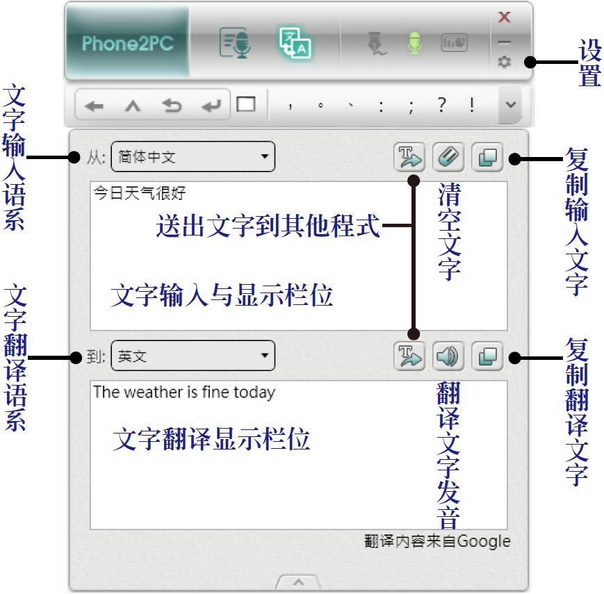 请参考前面﹝语音输入﹞功能的操作方式,一样使用语音输入的功能,然后将鼠标光标点击到上方的翻译来源窗格中,程序会自动把行动装置上的辨识结果传送到翻译窗口上,即能看到翻译的结果。