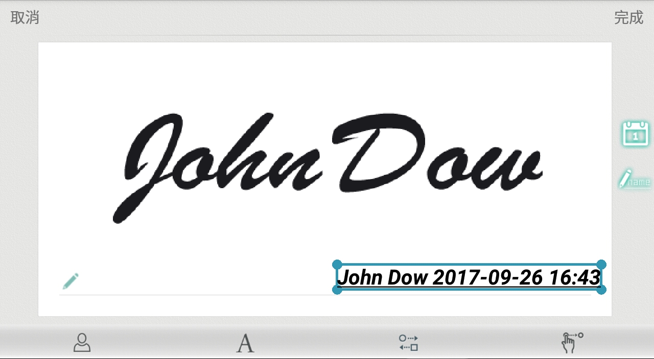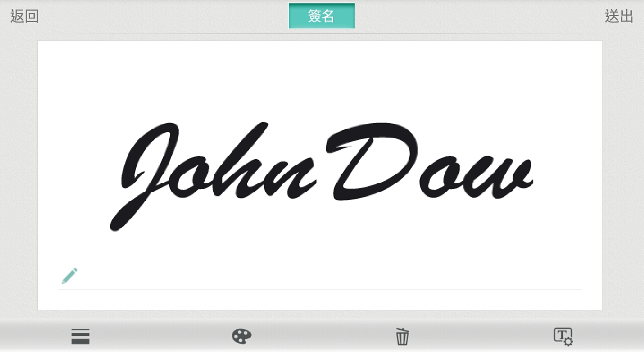 签完名后,点击右上角的[送出],即可在文件上看到您的签名,您可以将签名缩放并拖曳到想要放置的位置,并将文件存盘。