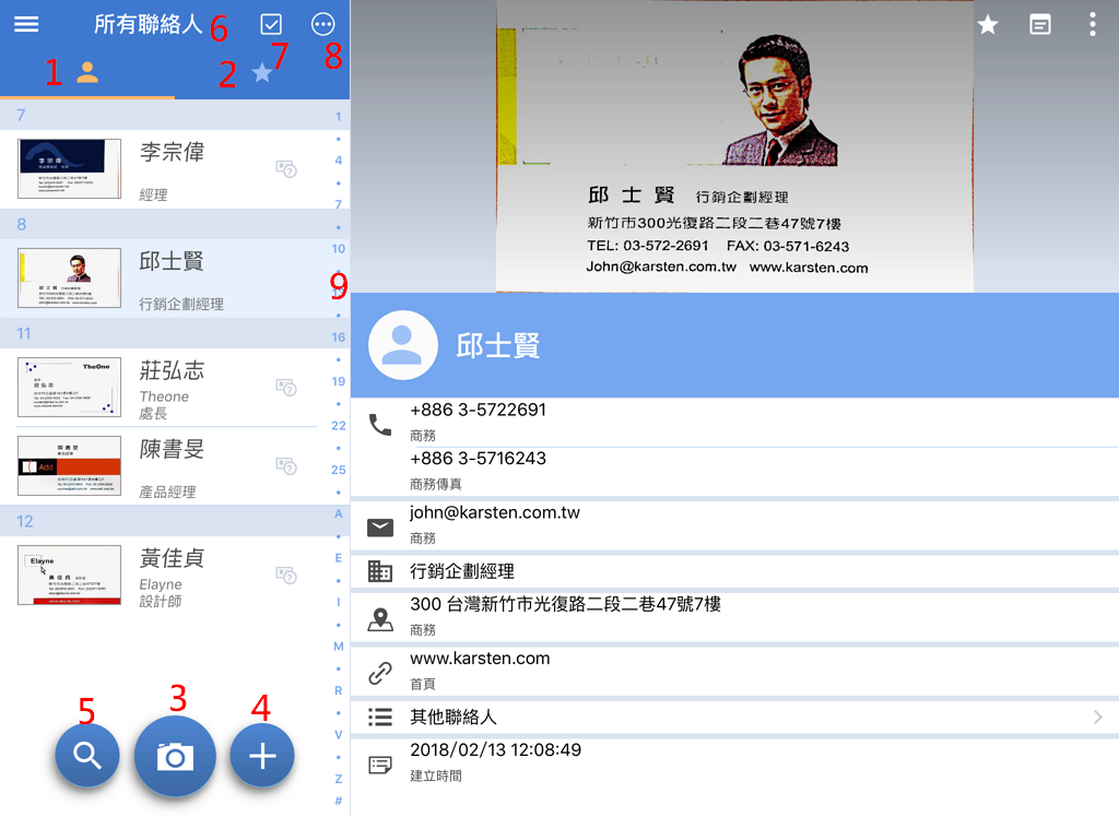 補充:在新增聯絡人後,您還可以幫聯絡人新增 / 更換名片圖,且可額外擷取圖片上的資料來辨識,也能新增聯絡人備註。操作方式請參考下一章節 [編輯聯絡人資料]。