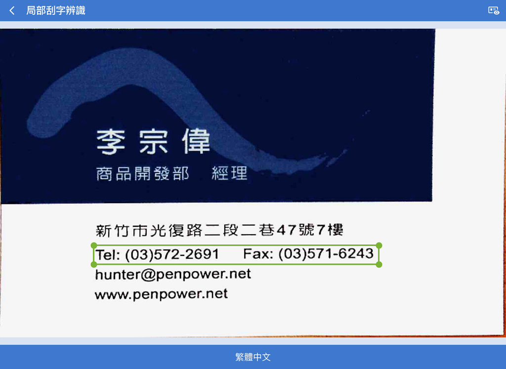 後會開啟局部刮字辨識的畫面,此時您可以用兩隻手指將圖片放大,並移動跟縮放圖中的綠色框框來把要辨識的欄位資訊給選起來,接著在畫面下方選擇要使用的辨識語系,點選右上方的