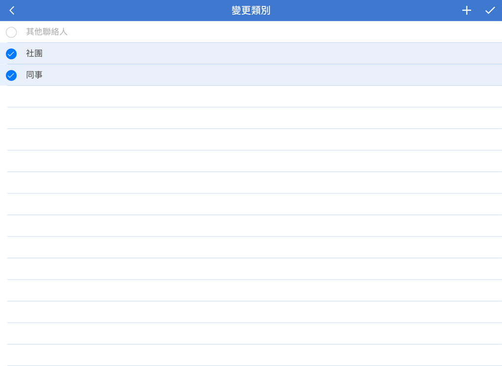 透過建立各種類別,您可以將聯絡人資訊做分類管理。點選主畫面左上方的