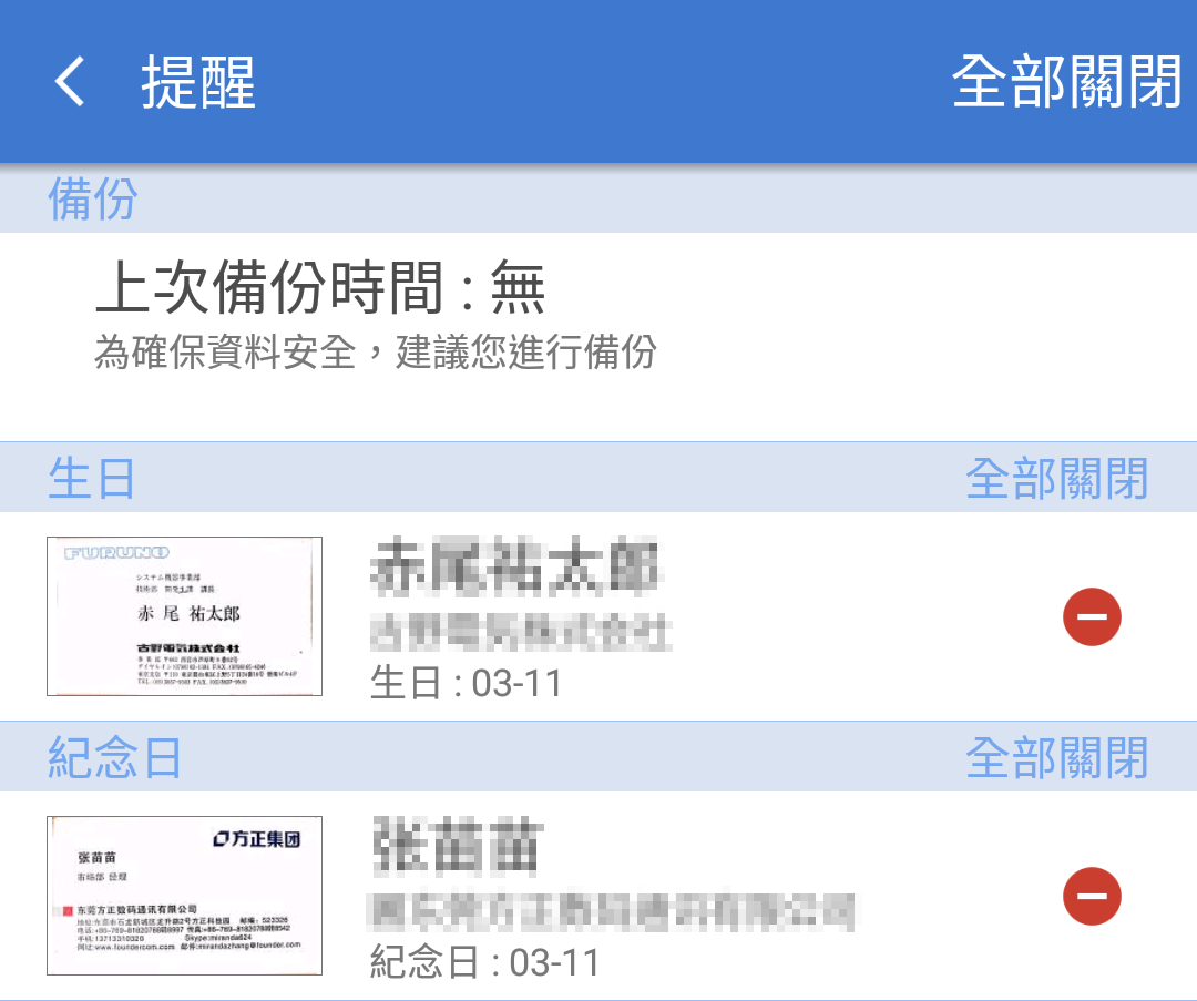 名片王Mobile提供幾項提醒的功能,可提醒您定期進行資料備份、在各聯絡人生日或紀念日前提醒,還有在新增聯絡人後提醒您跟對方進行聯繫。