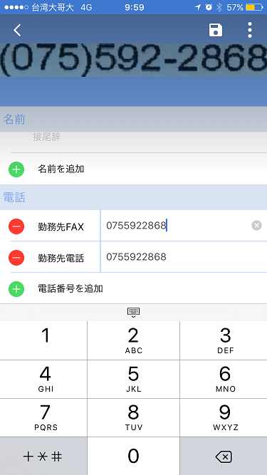 編集したいフィールドをクリックした、上方に該当フィールドのオリジナル画像を表示され、照合できます。この機能はこのモバイルフォンが撮影した名刺のみに適用します。インポートされたデータは適用しません。
