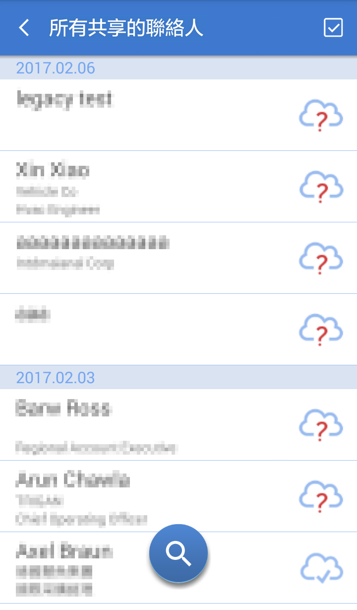 如果是連續拍攝 / 載入多張名片辨識時,會產生尚未校正過資料的聯絡人,點選此功能會把那些尚未校正過的聯絡人列出來,方便您作內容確認。尚未校正過的聯絡人會有
