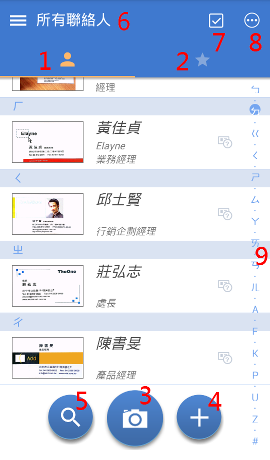 補充:在新增聯絡人後,您還可以幫聯絡人新增 / 更換名片圖,且可額外擷取圖片上的資料來辨識,也能新增聯絡人備註。操作方式請參考下一章節﹝編輯聯絡人﹞。