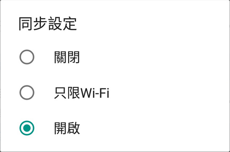 如果不希望浪費行動網路的流量,只希望在Wi-Fi連接時才進行自動同步,請設定為﹝只限Wi-Fi﹞;如果要手動同步,請選擇﹝關閉﹞。