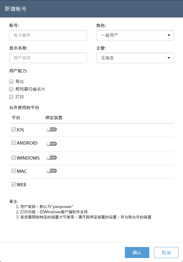 新建用户的默认登入密码为penpower,第一次登入时即会要求用户更改密码。