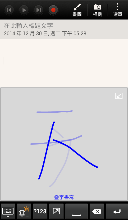 依照您的喜好,在 [書寫格格數] 或 [全螢幕書寫方式] 中選擇疊字書寫,即可回到手寫畫面中。